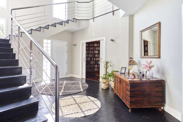 Una amplia escalera forrada de pizarra natural y con barandilla de acero da acceso a la segunda planta donde se encuentran los dormitorios.
